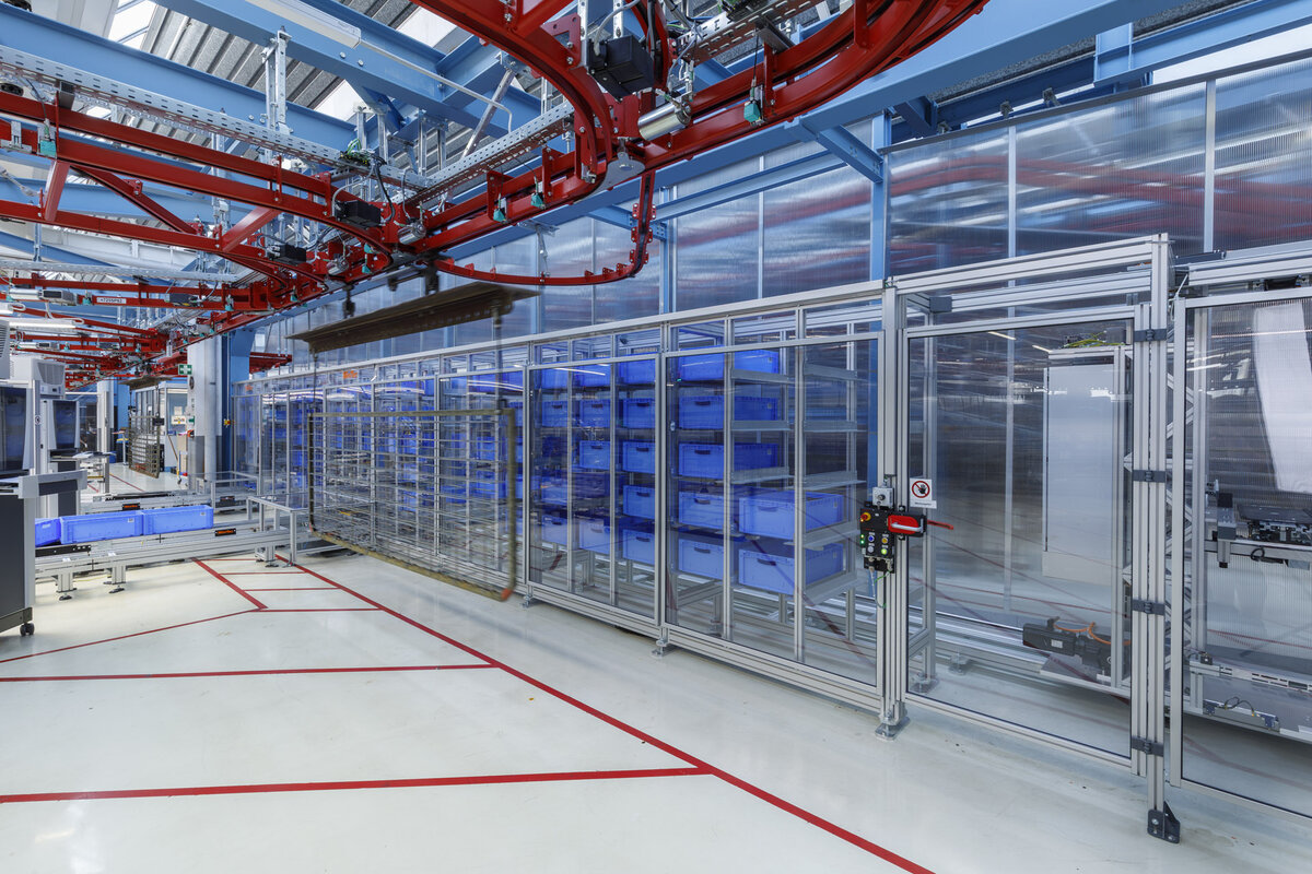 The system then collects the racks from the intermediate storage. The racks pass through the cleaning process on an overhead conveyor in various zones over a length of 60 meters. Next, they go to the drying room, then the cooling room, and finally the clean room. Depending on the technical specifications of the components, the cleaning rack either remains for removal or moves to the clean room where removal stations with robots are located.