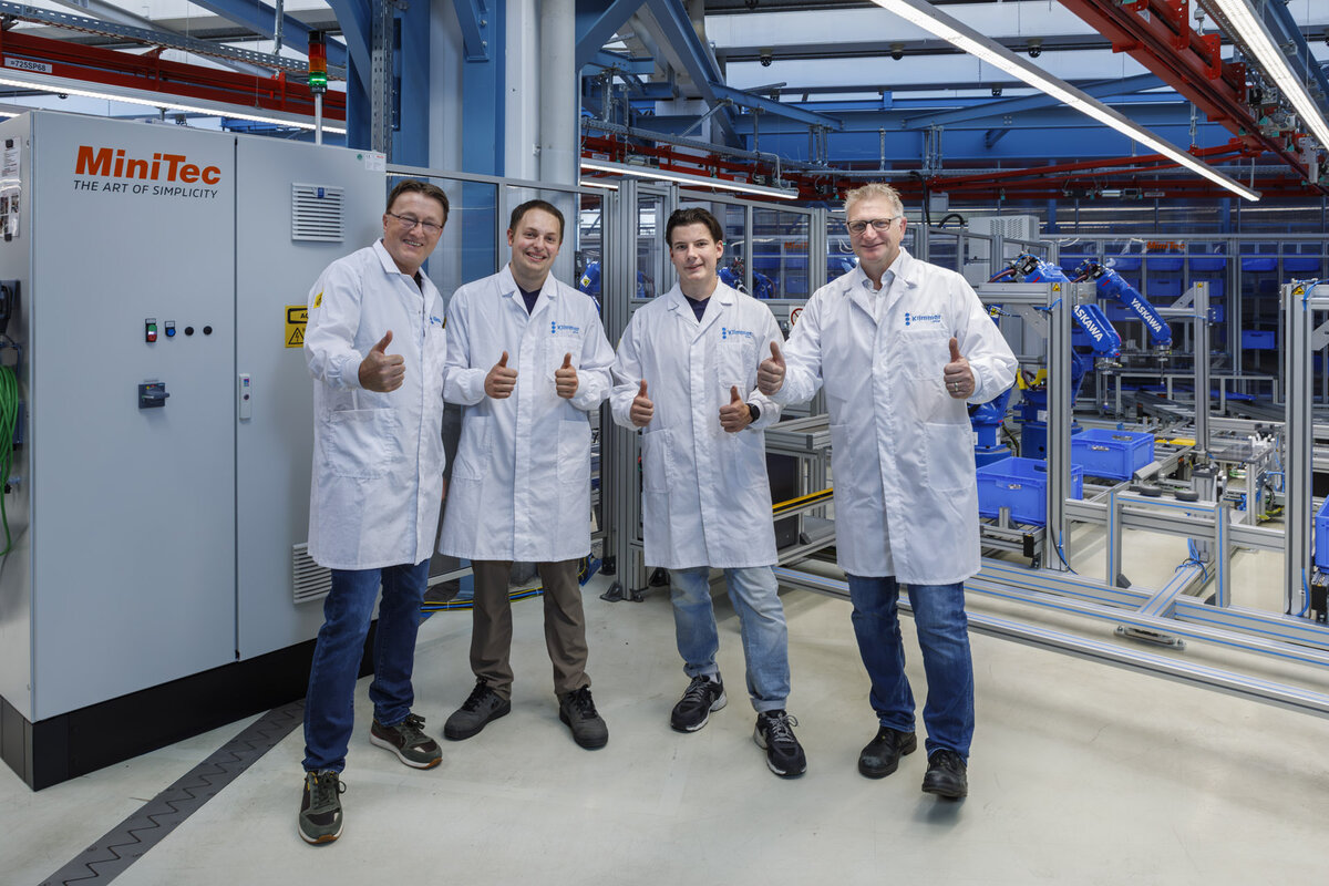 Picture: Thumbs up for the new automation solution (from left): Stefan Wache (MiniTec), Simon Bublies, Moritz Benzing and Joachim Hölzl (all HMT).